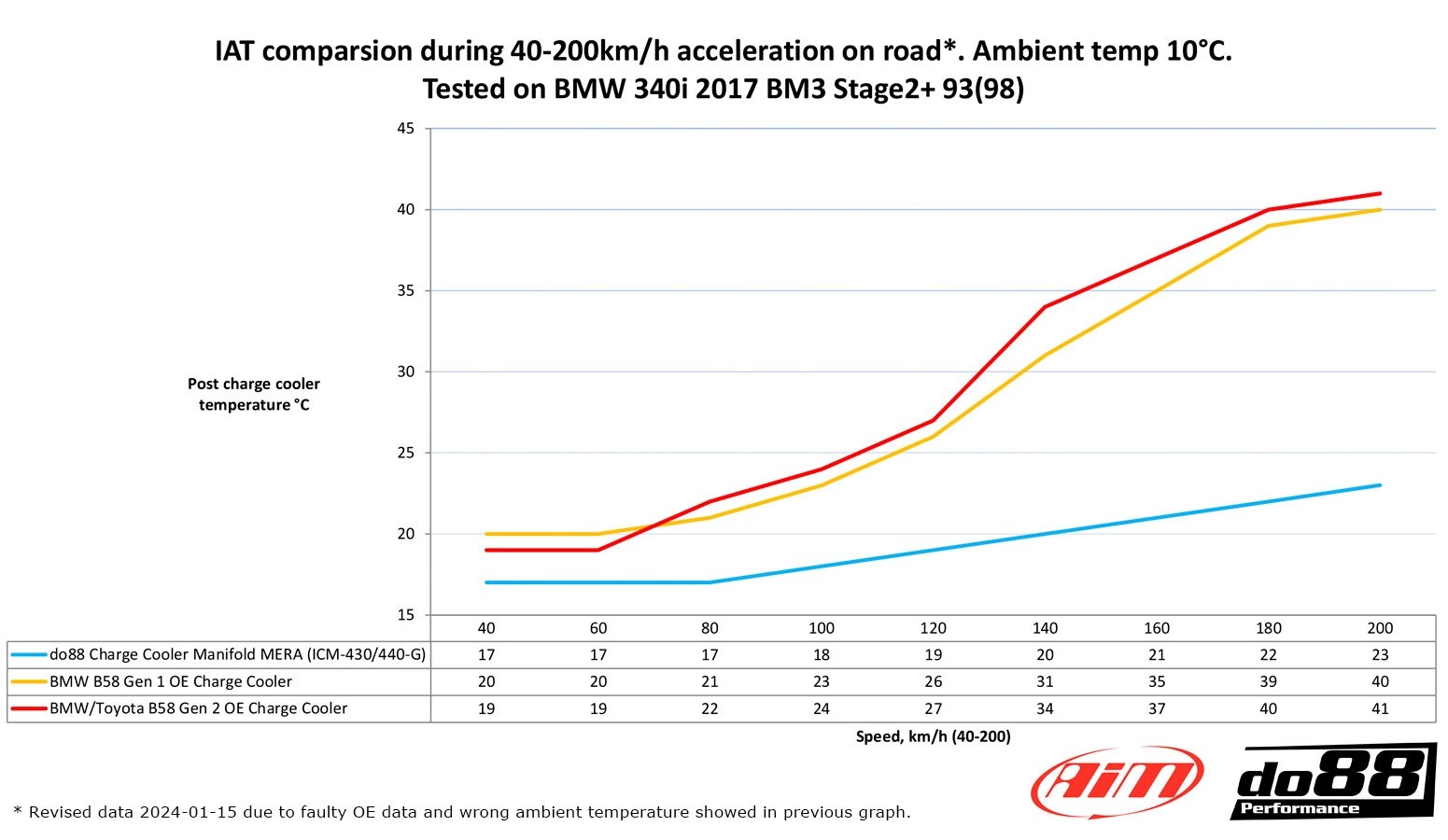 Lower inlet air temperature under identical conditions: 26°C compared to OEM 33°C. Exact figures to be found in the diagrams under the product pictures.