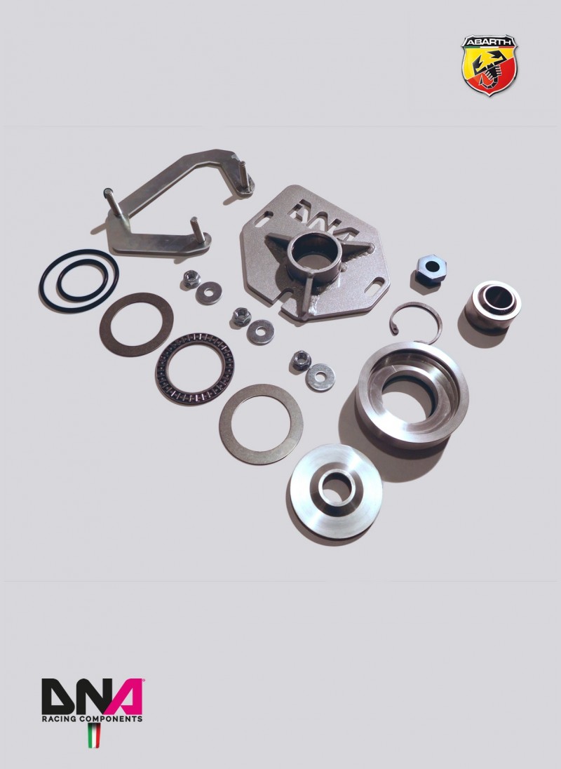 The kit includes: top spring platforms, adj. camber plates and uniball seats, motorsport uniball and shock nuts.The kit includes a particular spring platform with an axial bearing integrated in order to eliminate noises during steering.