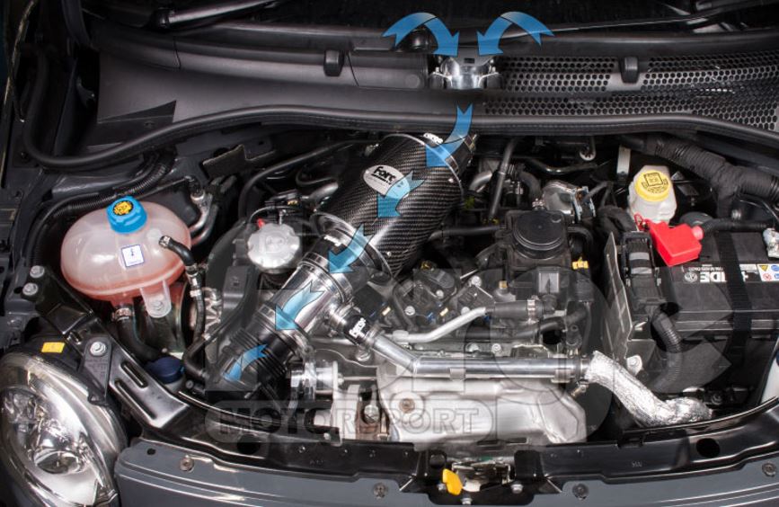 The cold air feed is drawn in from the scuttle panel, this maximises the density charge of air entering the turbo intake.