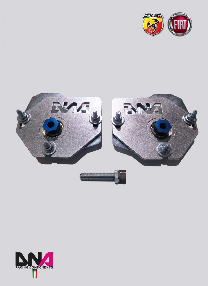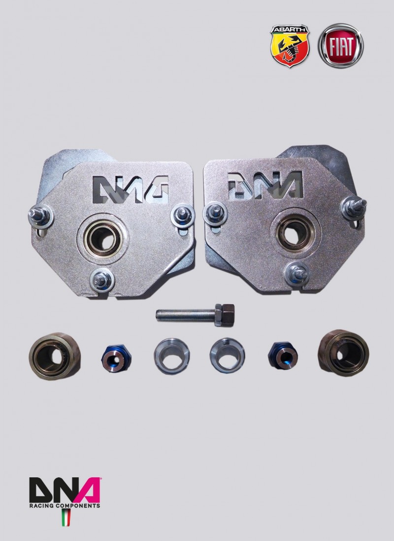 The kit includes: top spring platforms, adj. camber plates and uniball seats, motorsport uniball and shock nuts. The kit also includes a particular spring platform with an axial bearing integrated in order to eliminate noises during steering.