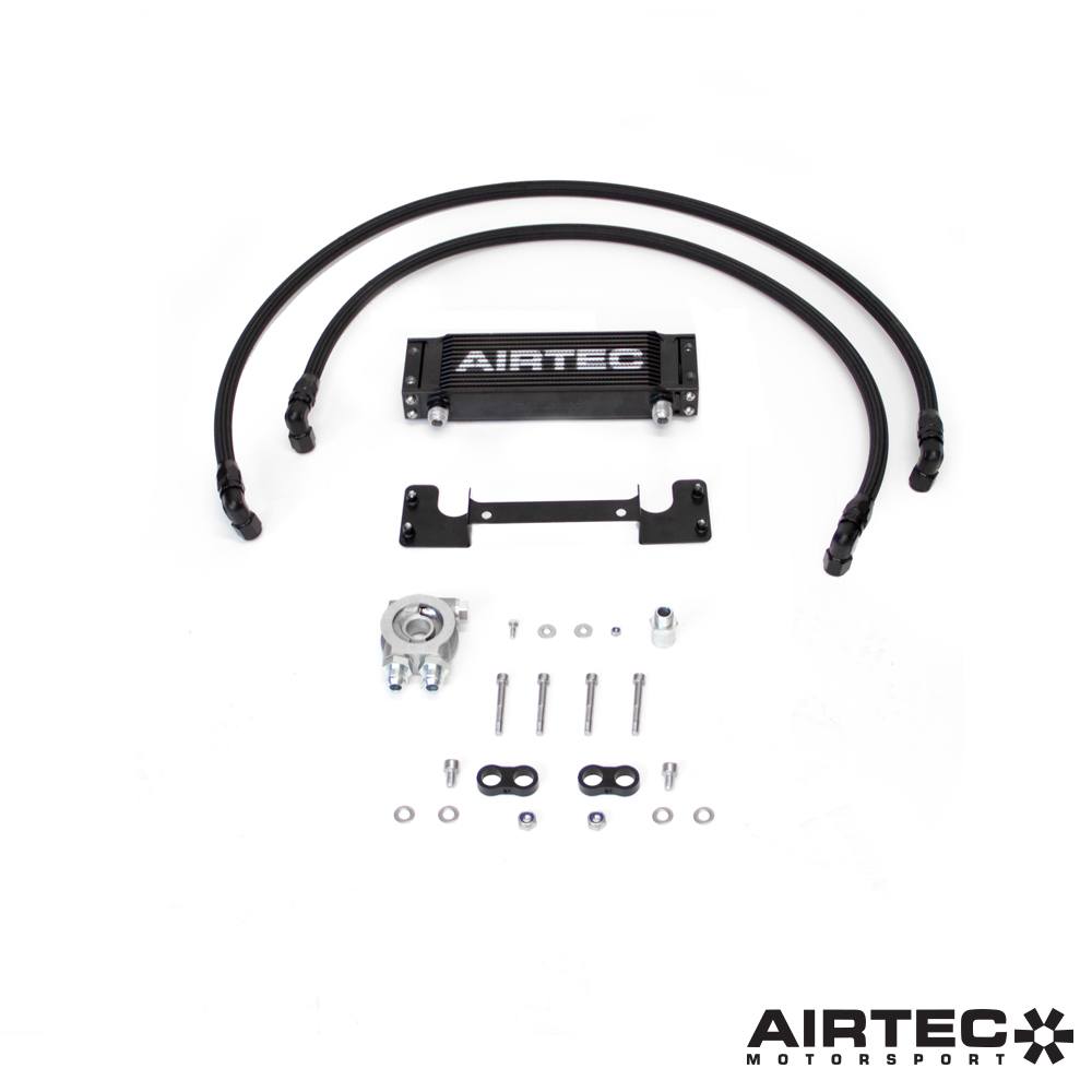The package includes a large AIRTEC Motorsport oil cooler with ducting, bespoke laser-cut and powder-coated brackets, high-quality braided hose lines with Aerotec fittings, and all fixtures, including instructions, for a simple bolt-on installation.