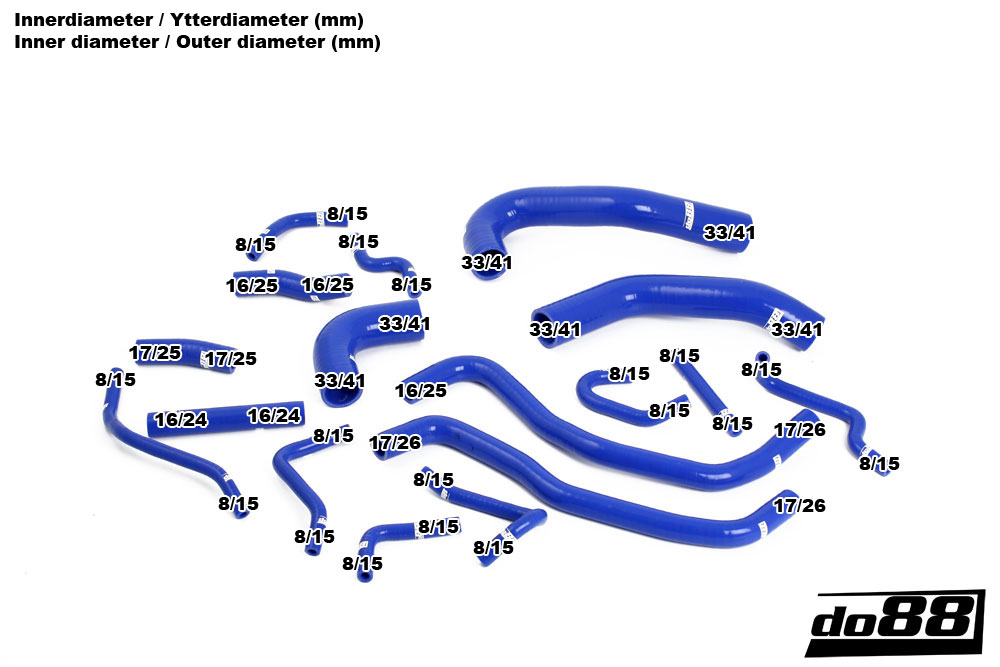 These hoses are entirely manufactured in high quality silicone for best finish and durability. With three to five layers of armory, depending of the inner diameter, the hoses withstand high pressure rates and high temperatures for a long time. The original hoses are manufactured in rubber that not seldom cracks from age. This is the durable solution for you that in addition improves the looks!