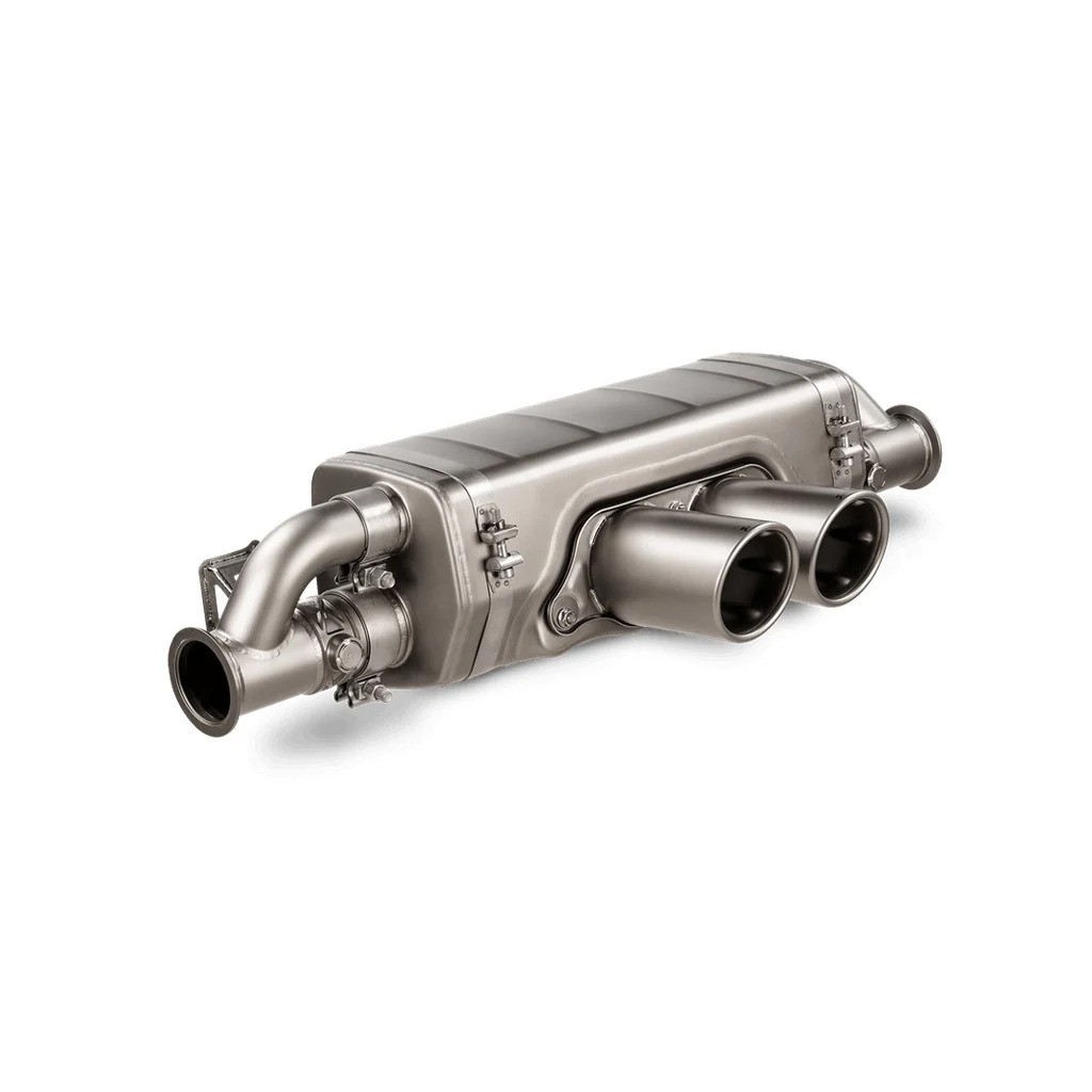Developed solely for the 911 GT3 RS (992), this high-grade lightweight titanium system is sandblasted and coated for durability. The completely new design includes twin tailpipes, with the outer shell coated and the inner sleeve featuring six imprints to match the six-cylinder engine, with an engraved Akrapovič logo to complete the visual effect. The housing of the exhaust valves – which have been tailored perfectly to the gas flow to produce a smooth, rich tone at normal cruising and a sporty sound experience at higher revs – and the collectors in the muffler are cast in the Akrapovič in-house foundry. When combining the Slip-On Race Line (Titanium) with the Slip-On Race Line Adapter (SS), the weight is decreased by 20.7% (3.5 kg) against the standard system and performance sees an increase of 10.4 kW (14.1 hp) in power at 2,600 rpm and a torque rise of 38.1 Nm at 2,600 rpm when tested on the Akrapovič dyno against a Porsche 911 GT3 RS (992) with a standard stock exhaust. This system is intended for use on closed-course competition circuits only because it is a racetrack-oriented part. No remapping of the ECU is required.