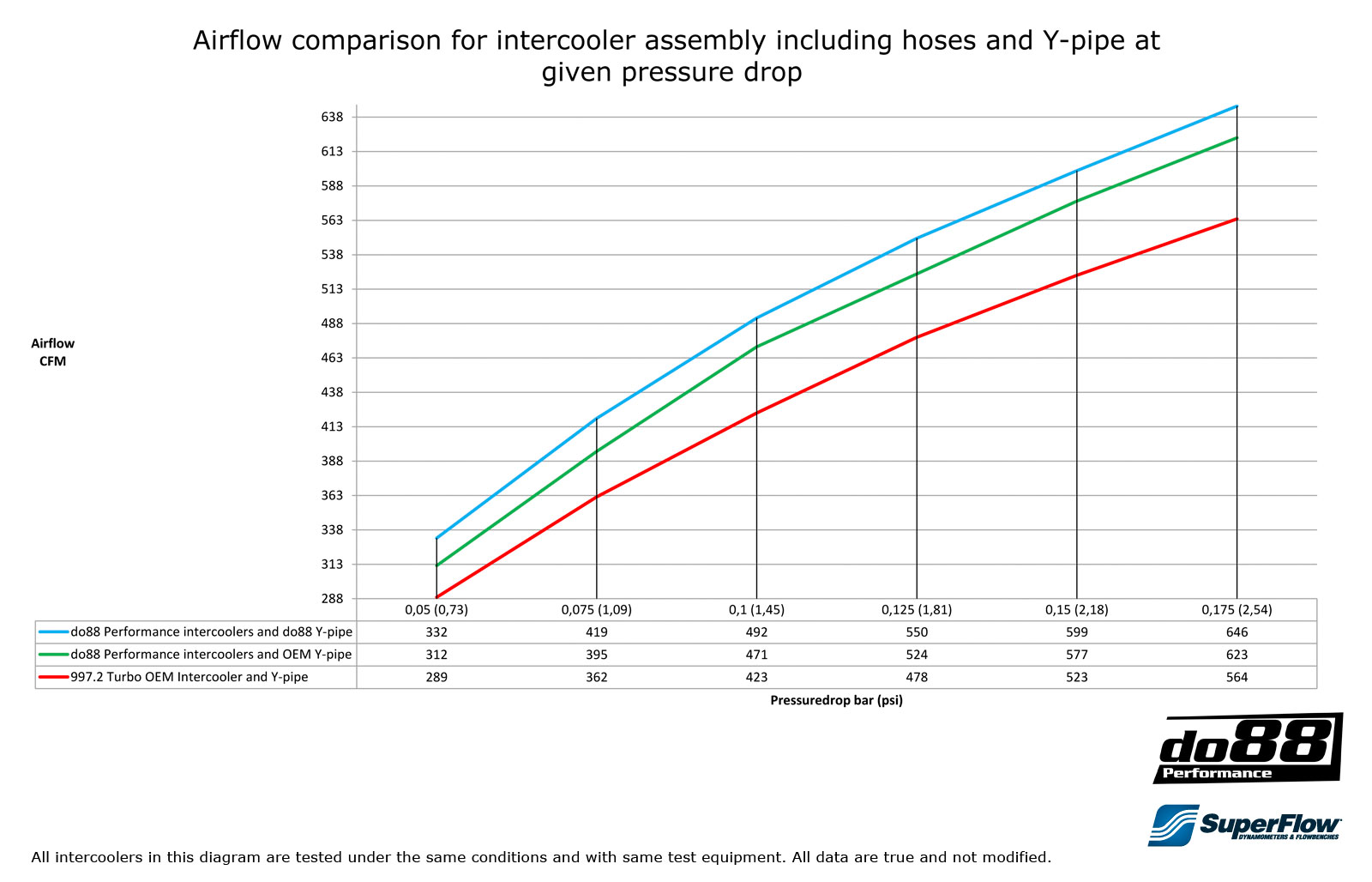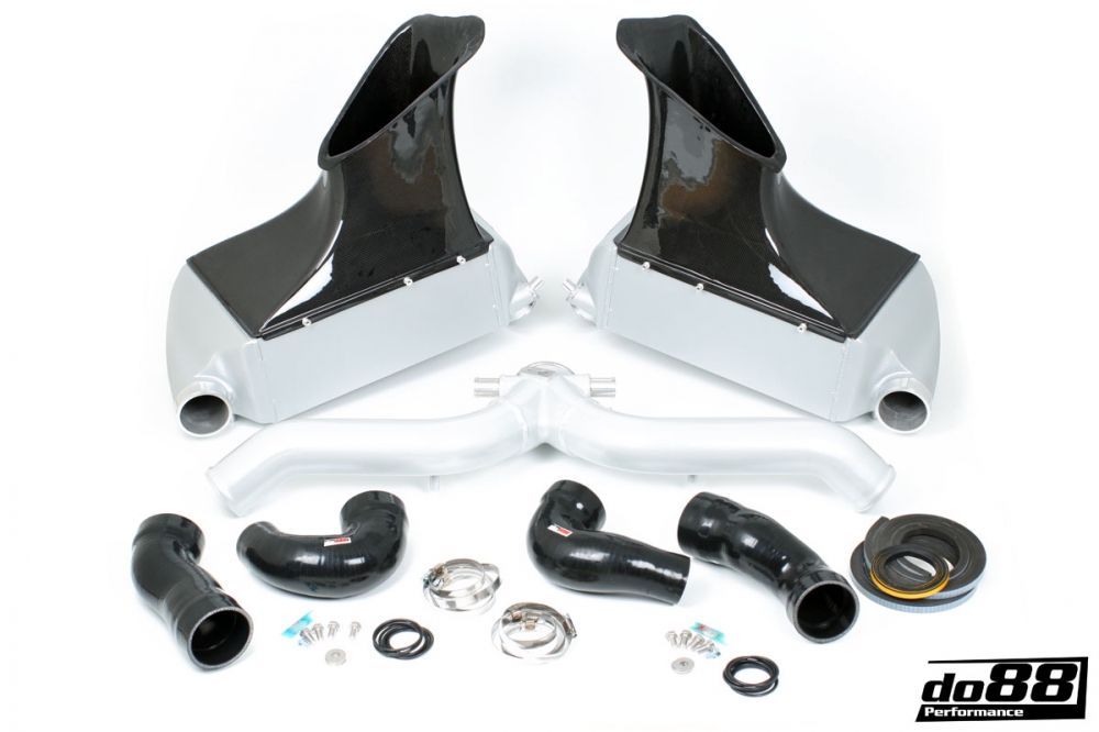 With this way to build do88 intercoolers the weight increase compared to the OEM ones was relatively small considering the size of our intercooler and that its all made of aluminium. do88 intercooler weight is 5,85 kg (12,89 lb) per piece and the 997.2 OEM intercooler weights 3,30 kg (7,27 lb) per piece. It might sound like a big weight increase but compared to other actors on the market with intercoolers in this size it's a low weight!