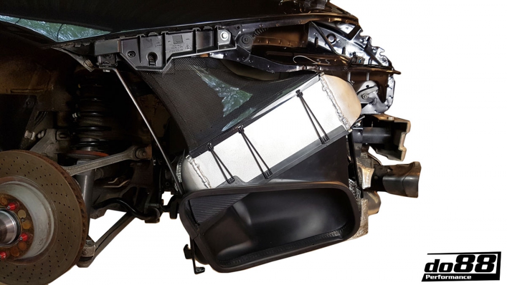 After do88 market research in the beginning of their intercooler development for 997 generation 2 they understood that not many of the upgrade products on the market are really upgrades but more at the same level as the 997.2 standard intercoolers or sometimes even lower. So already from the beginning do88 realized that they could not sacrifice anything to keep the cost down they just had to do the best possible in the space available in the car! First of all they made a lot of investigation and comparisons between different core types and at last really fell for a high density motorsport core which have great cooling efficiency among with a low weight. With a great core in place do88 started to refine the end tank design which brought them to a decision to make cast end tanks as they could then control the air flow distribution over the core in a very precise way. This is very important as a good tank design will be beneficial for both pressure drop and cooling efficiency. To be able to fit an intercooler with appropriate thickness for the job it was also necessary to design a new upper ambient air guide. This was designed in our 3D scanned environment to ensure perfect fit to the vehicle integrated air guides and our intercooler. To achieve the best air flow distribution over the core we made intercooler end tanks with 70 mm (2 3/4 inch) connections which then made it necessary to designed custom silicone hoses for all positions. The hoses are 3D designed with airflow in mind where do88 CFD tested each hose during development to ensure best possible flow rate of all parts! The hoses between turbocharger and intercooler are special silicone hoses that can withstand up to 240°C (464°F) continuous temperature! Another important aspect for cooling performance are to use all ambient cooling air available, to optimize this part we include air block rubber seals for all surfaces where the ambient air guides must seal properly.