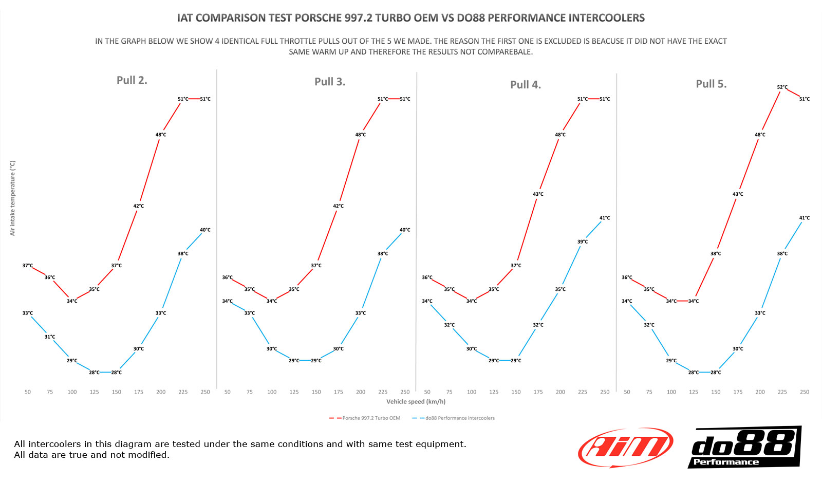 With this way to build do88 intercoolers the weight increase compared to the OEM ones was relatively small considering the size of our intercooler and that its all made of aluminium. do88 intercooler weight is 5,85 kg (12,89 lb) per piece and the 997.2 OEM intercooler weights 3,30 kg (7,27 lb) per piece. It might sound like a big weight increase but compared to other actors on the market with intercoolers in this size it's a low weight!