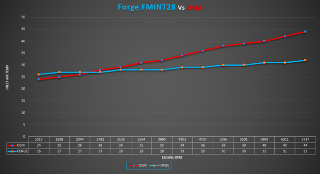 To give consistent result which reflects real-world driving conditions, the dyno pulls were done with the car up to temperature with the radiator fans tripped on. With the OEM cooler two consecutive runs showed a maximum temperature of 44°C at 6747rpm. With FMINT28 installed we ran four consecutive runs, and the temperature didn’t rise to any more than 32°C at 6717rpm. This 12°C is a massive temperatire decrease of 32%.