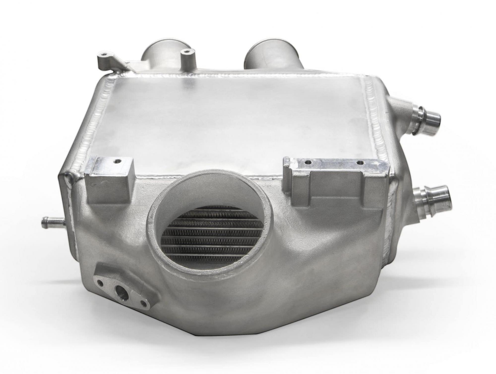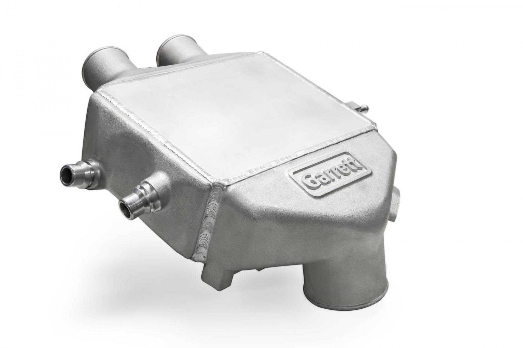 Garrett Powermax™ direct fit performance charge air cooler for the 2015+ BMW M3 and M4 boasts a 47% larger core with dual pass coolant flow to help reduce intake manifold temperatures by an average of 10 °F. Optimized end tanks improve air flow through the core.