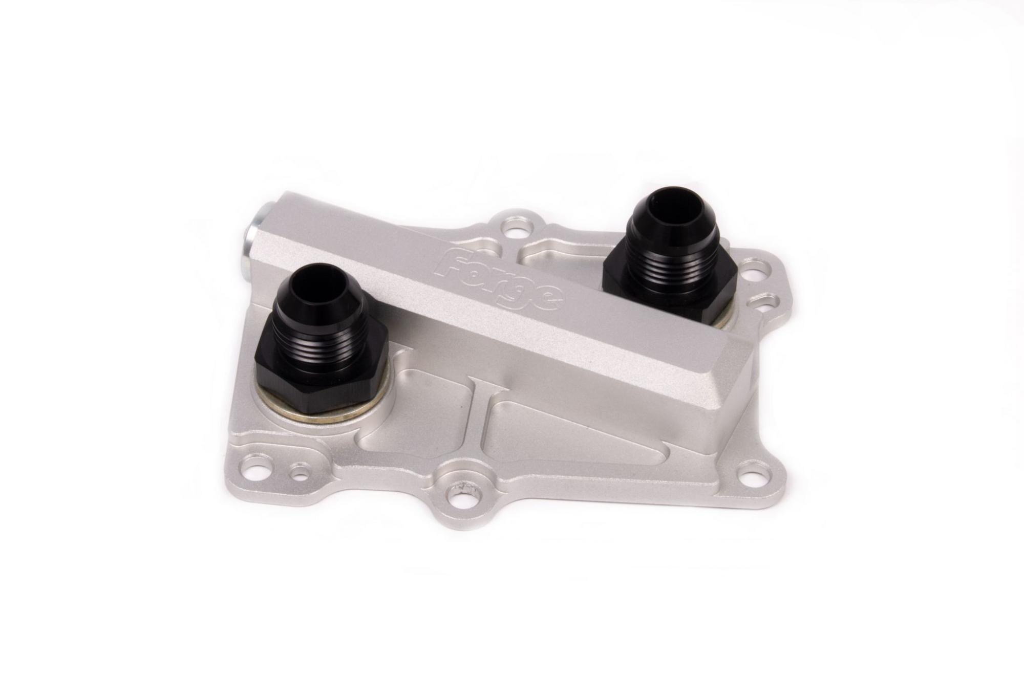 Forge Motorsport have designed a CNC machined billet adaptor that replaces the oil to water cooling block. Although it still allows coolant to circulate, it more importantly offers two AN-10 take offs which allow fitment of the supplied oil cooler lines between the cooler itself and the Fiats engine oil galleries. In turn, this means oil temperatures can be significantly reduced resulting in an engine that can be worked harder for longer.