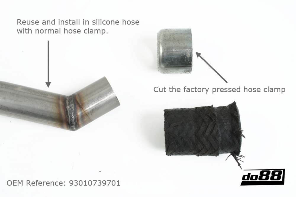* The pressed hose clamps needs to be cut on the two original hoses and then the hose connection and the steel pipe must be reused. They are installed on the new silicone hoses with regular hose clamps.