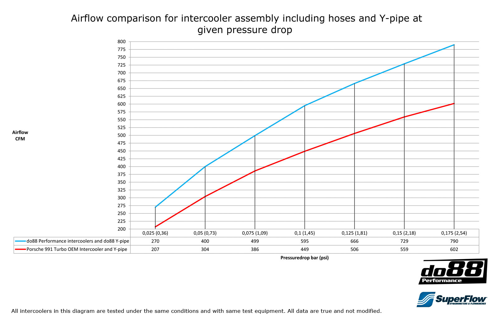 This diagram shows the air flow at different pressure drops of do88 intercooler compared to the OEM: