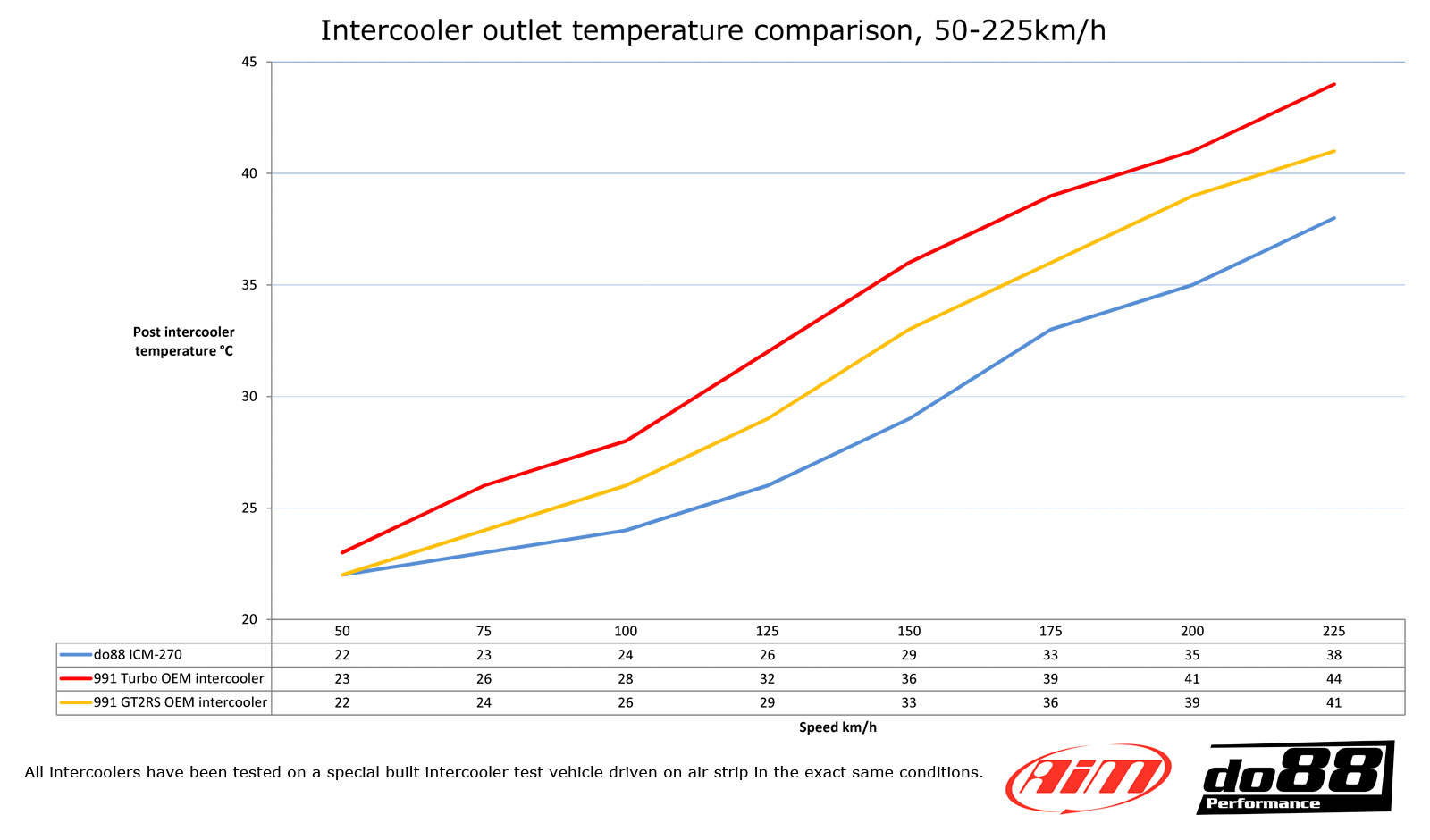 This diagram shows intake air temperature of do88 intercooler compared to the OEM: