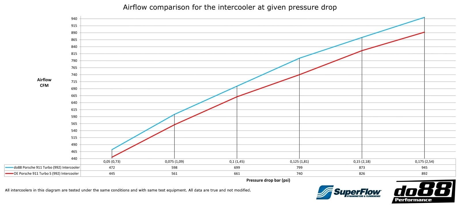 A hűtés fontos, és a légáramlás is. Sok óra fejlesztés után, a végtartályok finomítása és az igényeinknek megfelelő mag kiválasztása után az eredmény egy olyan intercooler, amely sokkal hatékonyabb a hőátadás és a légáramlás szempontjából. Házon belüli áramlási padunk, a Superflow SF-1020 Probench segítségével a légáramlást mind a do88 intercoolereknél, mind az OE 992 egységeknél ellenőrizzük. Amit látsz, azt kapod – igazi teljesítmény!