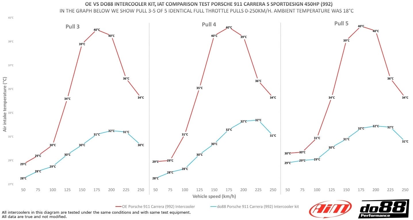Először 4 menetet hajtottak végre a 992-es OE intercoolerekkel felszerelt autóval. Állj, gyors alkatrészcsere a do88 intercoolerekhez. Shakedown néhány percig, majd öt futam pontosan ugyanúgy, mint az OE alkatrészeknél. A belépő levegő hőmérsékletének csökkenése jelentős, delta csúcsértéke 12°C (21,6 F). Lásd az alábbi grafikont!