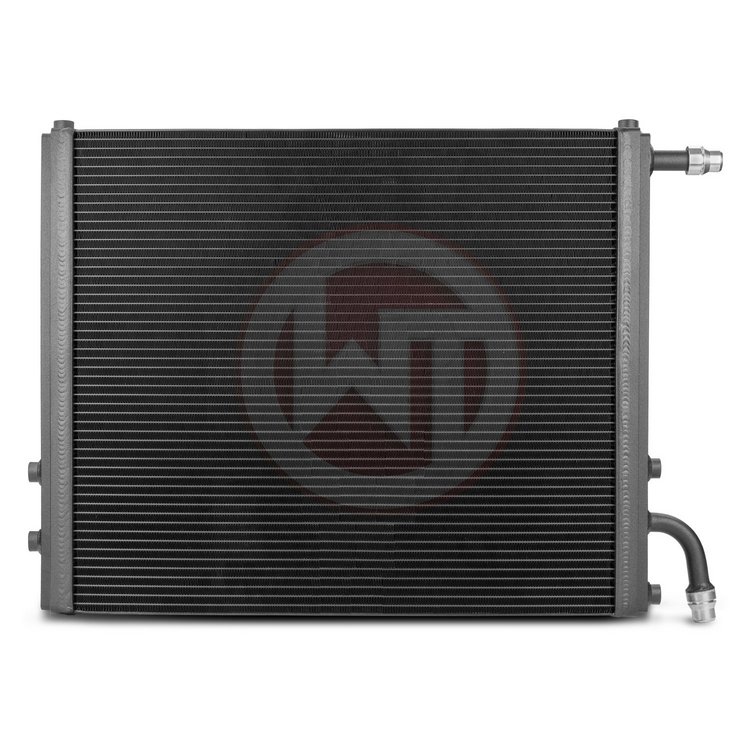 The 2.0 Liter B48 and the 3.0 Liter B58 turbo engine of the specified BMW/Toyota models is equipped with an indirect charge-air cooling circuit. So the cooling of the charged air is not realized by the ambient air as cooling medium (as usual), but made with its own cooling water circuit. A reduction of the temperature of the cooling water is directly equated with an improved cooling performance of the charged air. This is exactly where the advantages of the WAGNERTUNING upgrade radiator comes into play. The new developed competition racing core of the WAGNERTUNING high performance radiator increase the radiator volume of the OEM water cooler by a total of 117 %. The calculated ratio between the inner and outer cooling surface generates a maximum heat transfer and allows at the same time enough air flow for the surrounding components (for example the engine radiator) for its own heat exchange. Furthermore, using an increased amount of cooling water, the entire system thermics can be kept at a lower level over a longer period of time.