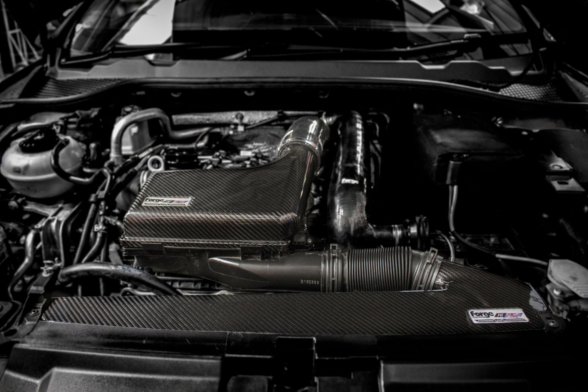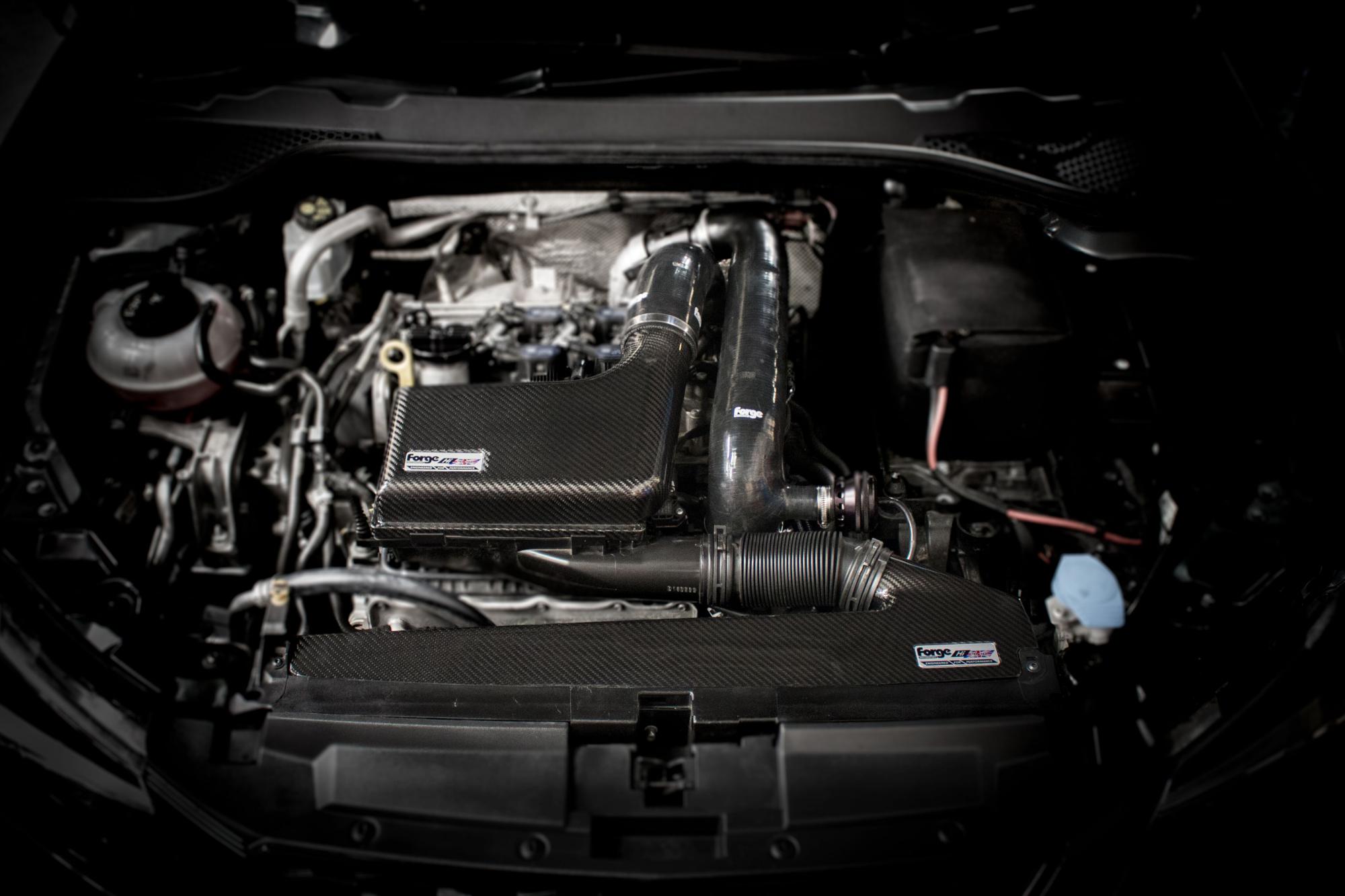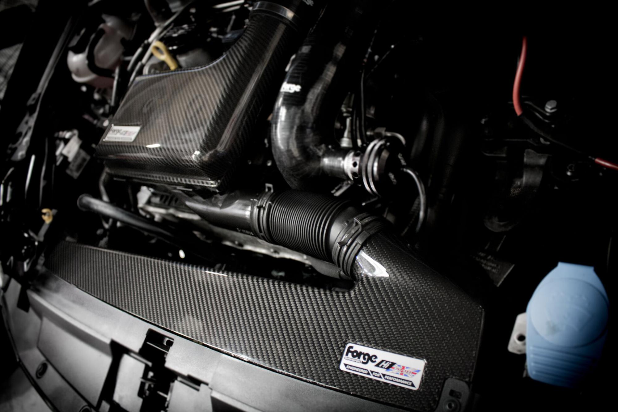 The Forge Motorsport high flow intake hose that is mated to the carbon airbox eliminates the highly restrictive plastic and noise restricting inlet pipe, and replaces it with our smooth bore multi-ply silicone hose which increases air flow, improving efficiency and performance. This equates to increases of up to 10hp which is a remarkable gain for an easy to fit bolt on modification.