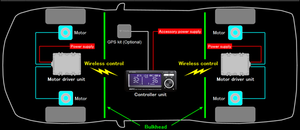 Motor driver units, located at front and back of the car, and controller unit are connected wirelessly, to reduce time-consuming cable runs. Controller unit has all the sensing functions, with built-in optical sensor to detect brightness in its surroundings and connectivity with optional GPS kit to detect vehicle speed. The power supply cable is the only wiring required between the controller and the vehicle, making it possible and easier to install onto wider varieties of vehicle models. Well-considered size and design enable controller unit to be installed to most desirable position easily without any bulky wiring.