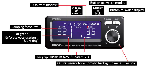 EDFC ACTIVE offers lots of extra features including adjustable display color and G-force display. In addition, with optional GPS kit installed, vehicle speed, altitude, longitude, latitude, trip meter and/or clock can be displayed.