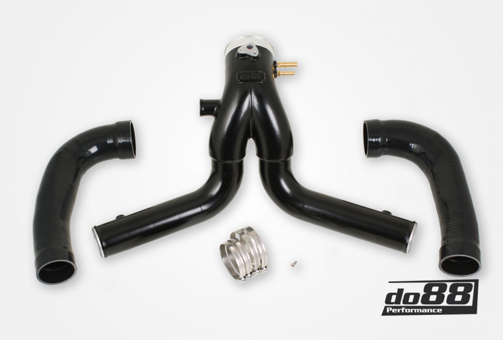 We are proud to present our newly developed Y-pipe kit for 991 Turbos! With this extreme high flow Y-pipe kit the performance of your 991 will increase!- Made of 2,5" (63mm) mandrel bent aluminium pipes. - The pipe has two methanol injection connections (1/8 -27 NPT). The pipe is delivered with blanking plugs in these connections. - Smooth flow cast collector part. - Smooth internal surface for best air flow. - Comes with high quality silicone hoses and accessories for installation. In the beginning of the development process of this product we spent a lot of time thinking what would be the preferred way to build a Y-pipe and here is the result of our conclusions and development process! Our pipe have both a very good flow rate and a low weight which is accommodated by composing mandrel bent lightweight pipes with a high quality 3D freeform designed cast joint between them. Onto the cast part we then welded CNC-machined connections for bov and breather hoses. This construction adds a lot of performance but only a tad of extra weight. The pipes are then finished in a high quality powder coat that makes them look as good as they perform! You can choose between the more discrete semi gloss black and a fresh silver metallic finish. The kit also includes 2 high quality custom designed silicone hoses which is available in two different versions. Which version you need depends on if you will install the y-pipe together with the OEM intercoolers or the do88 performance intercoolers. You can make your choice of hoses in the drop list above. When it comes to air flow performance our Y-pipe totally outperform the OEM Y-pipe by 58% increased flow at the same pressure drop! ![]() Be aware of that the OEM parts was designed for the power level the car was built for originally. A power increase may cause your stock Y pipe to hold back the power of your engine. So even on an engine with a software tune the do88 performance Y-pipw will give a performance increase over the OEM Y-pipe! do88 performance Y-pipe comes as a complete package with all parts necessary for installation. Click here for installation guide! Included parts in this kit: 1. Full aluminium performance Y-pipe 2. Silicone hoses 3. Hose clamps |