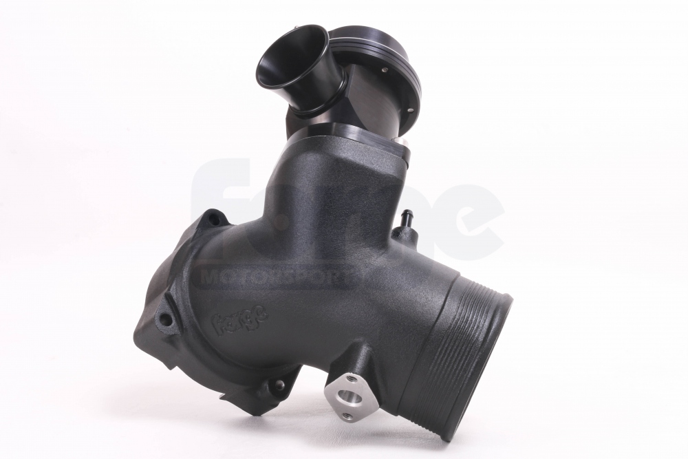 Forge looked closely at this issue, and noted that there would be no real fix for this as the size of the hole for the valve is too small in the stock elbow. Forge decided that Forge would re-design and produce our own elbow, allowing a much larger DV port, which in turn would allow fitment of a larger valve to take advantage of it.